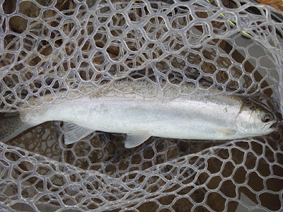 What was a skunking turned into 25 minutes of activity, all in about 20 yards of water. Swinging an olive woolly bugger I hooked into what I thought was a good size chrome. It fought hard, and then jumped not more than a rod length away from me. I smiled when I realized it was one of the young steelhead. It continued to put up a good fight, but quickly found the bottom of the net. I want to catch this same fish in a couple of years.